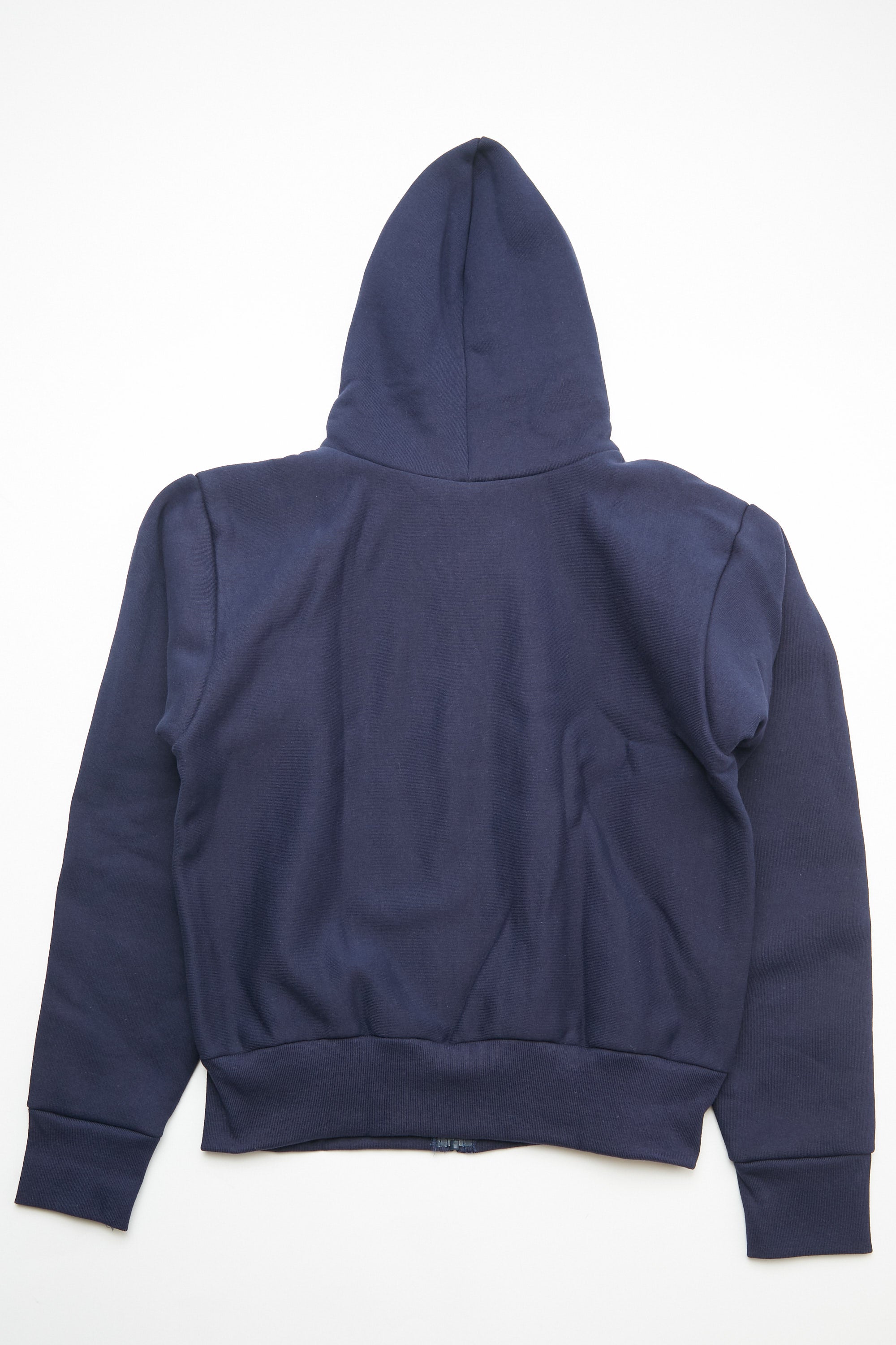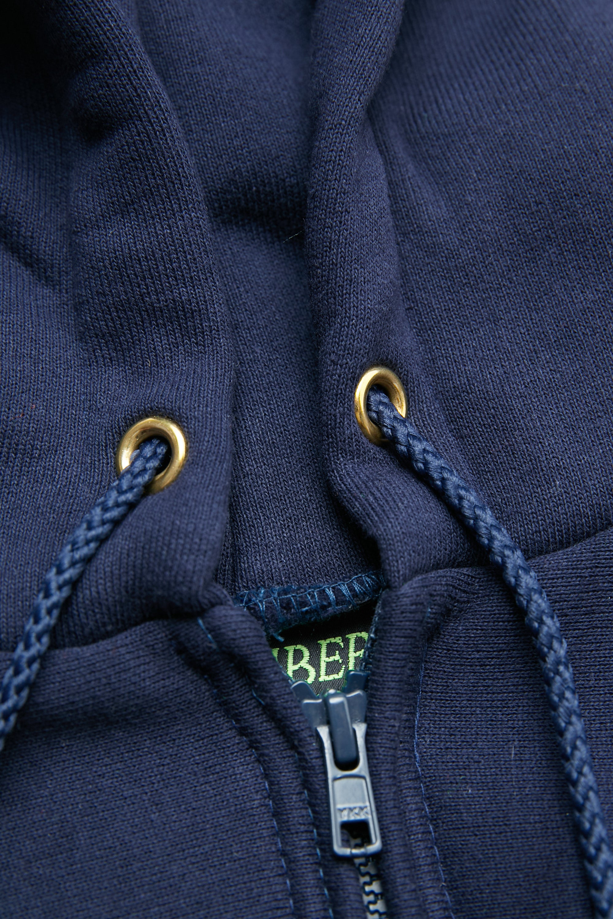 Heavyweight hooded sweatshirt. Drawstring hood with brass eyelets. Plastic zipper. Set-in sleeves. Muff pockets.