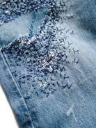 Made by skilled KOUNTRY craftsmen, this denim is inspired by well-worn pants that have endured three years of hard use. Sporting sashiko stitching, damage, and a faded look, each piece is uniquely remade. Be aware that due to the use of IDG dyes, some color transfer may occur when worn. Keep in mind that this product is purposely aged and features tears and damage intended as part of the design, not as defects. Plus, since it mimics the effects of aging, you may notice some weakening of the fabric. Made from 100% cotton with a touch of cowhide leather.