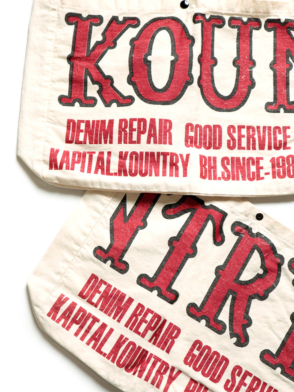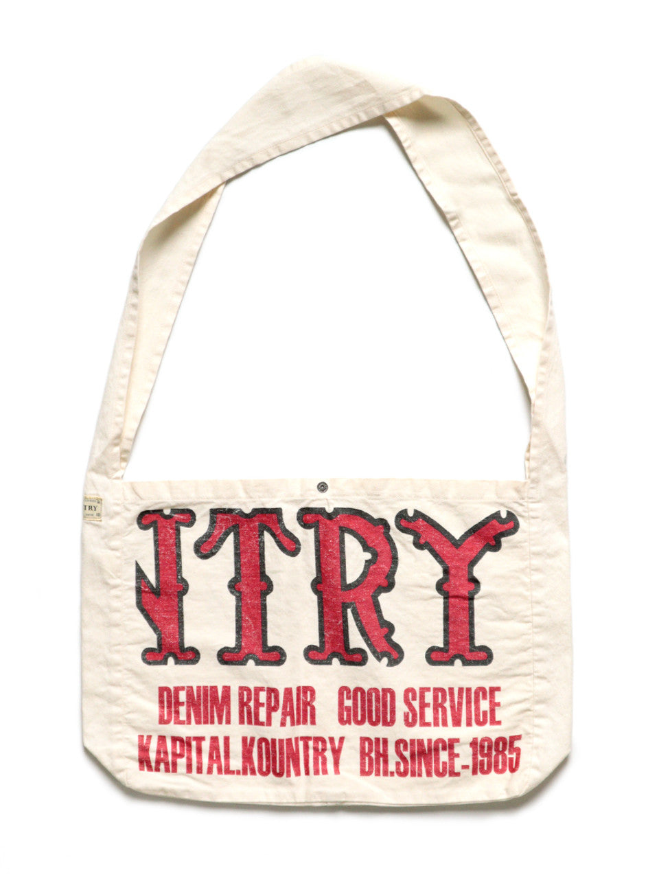A cotton twill tote bag with a roomy gusset. Features the throwback KOUNTRY label design. *Please note: The print on this item is not permanent and may peel off from normal use or washing. Made of 100% cotton.