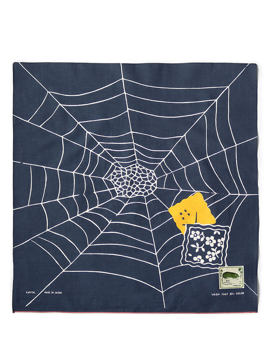 A selvedge bandana that combines a wide spiderweb and peckish rainbowy.