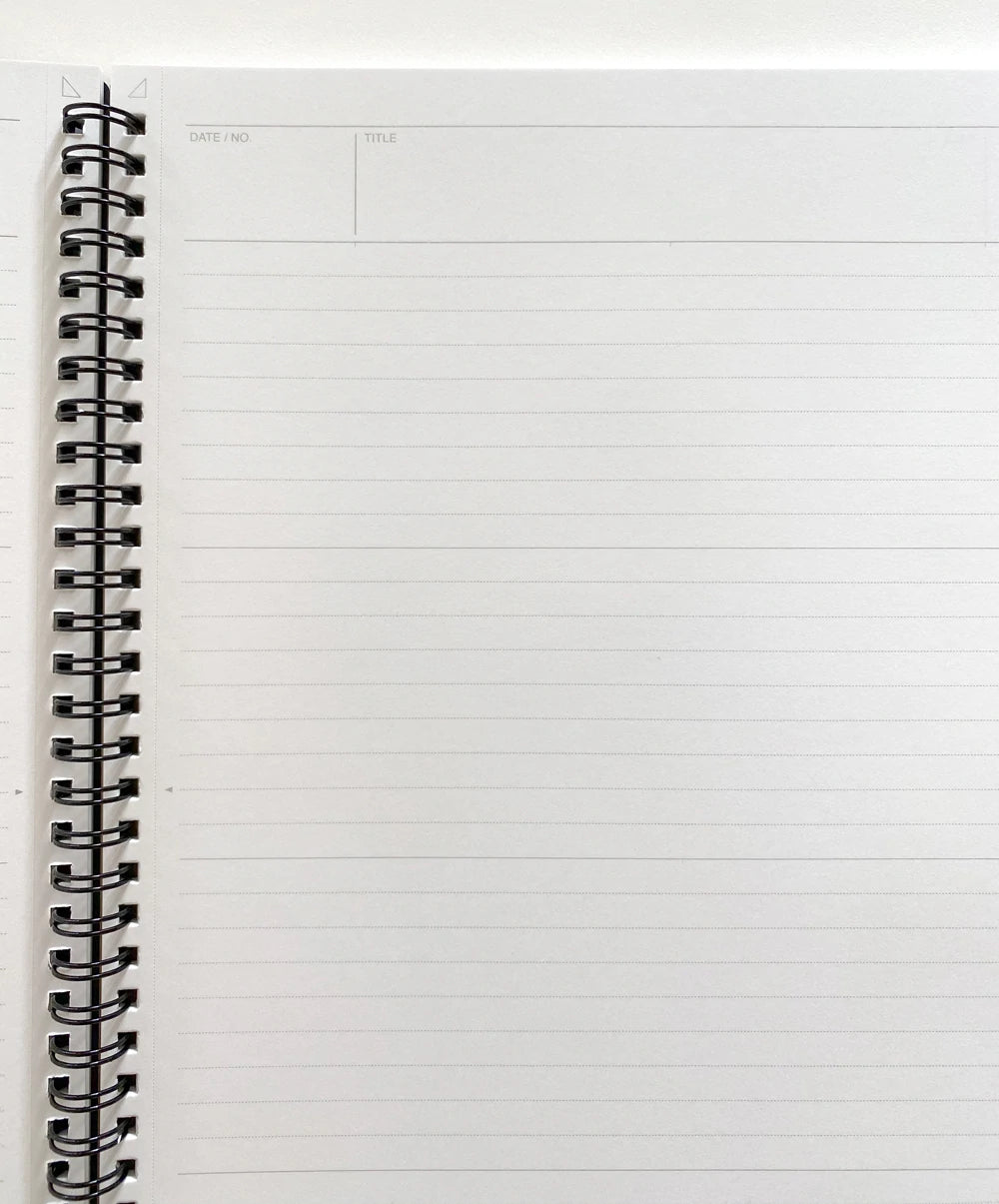 Measures 9.1 x 11.6 inches and contains 70 A4 size (8.3 × 11.7 inches) micro perforated sheets. The front side of each sheet features a subtle light gray lined print, while the back side of each page is blank. The graph pages have a space on the top line for “Title” and “Date/No” and features a small gray arrow in the middle of the top to signify the midpoint of the page. Pages are acid-free so they won't yellow over time.