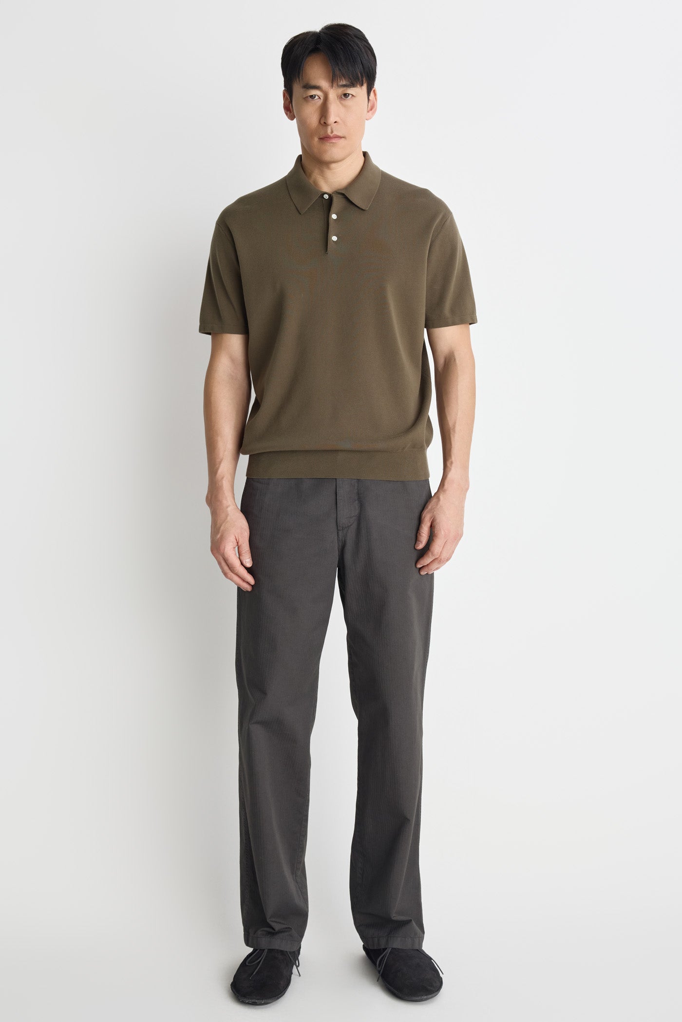 These officer chino pants feature a deep color sense and herringbone pattern created with a dyeing technique. The vintage dyeing process emphasizes the classic, vintage mood unique to chino pants. The silhouette gradually tapers toward the hem, creating a casual yet formal atmosphere that allows for a variety of styling options.