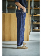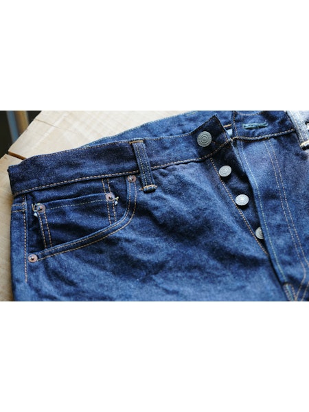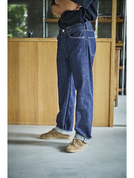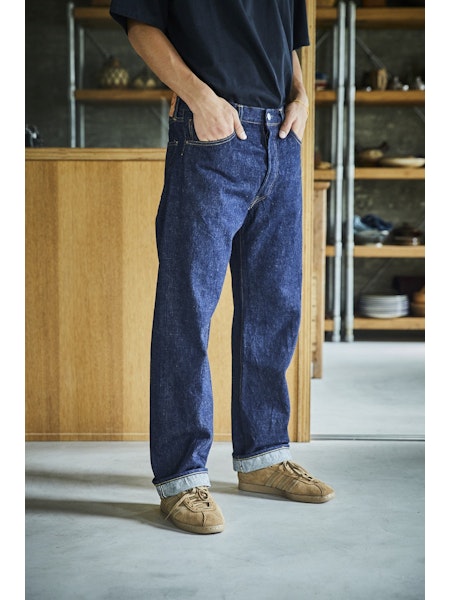 A model designed based on an analysis of jeans from the early 1950s. The denim, woven on vintage shuttle looms using yarn spun on a 1953 machine, develops a natural, uneven fade similar to that of 1950s jeans. For stitching, cotton thread is used, which blends well with the cotton fabric and undergoes aging over time, just like the material. Produced using manufacturing methods faithful to the 1950s, the side seams twist toward the right with wear. This is not a defect but a deliberate reproduction of the characteristics of jeans from that era. The silhouette will be slightly wider compared to our classic 105 STANDARD SELVEDGE DENIM.
