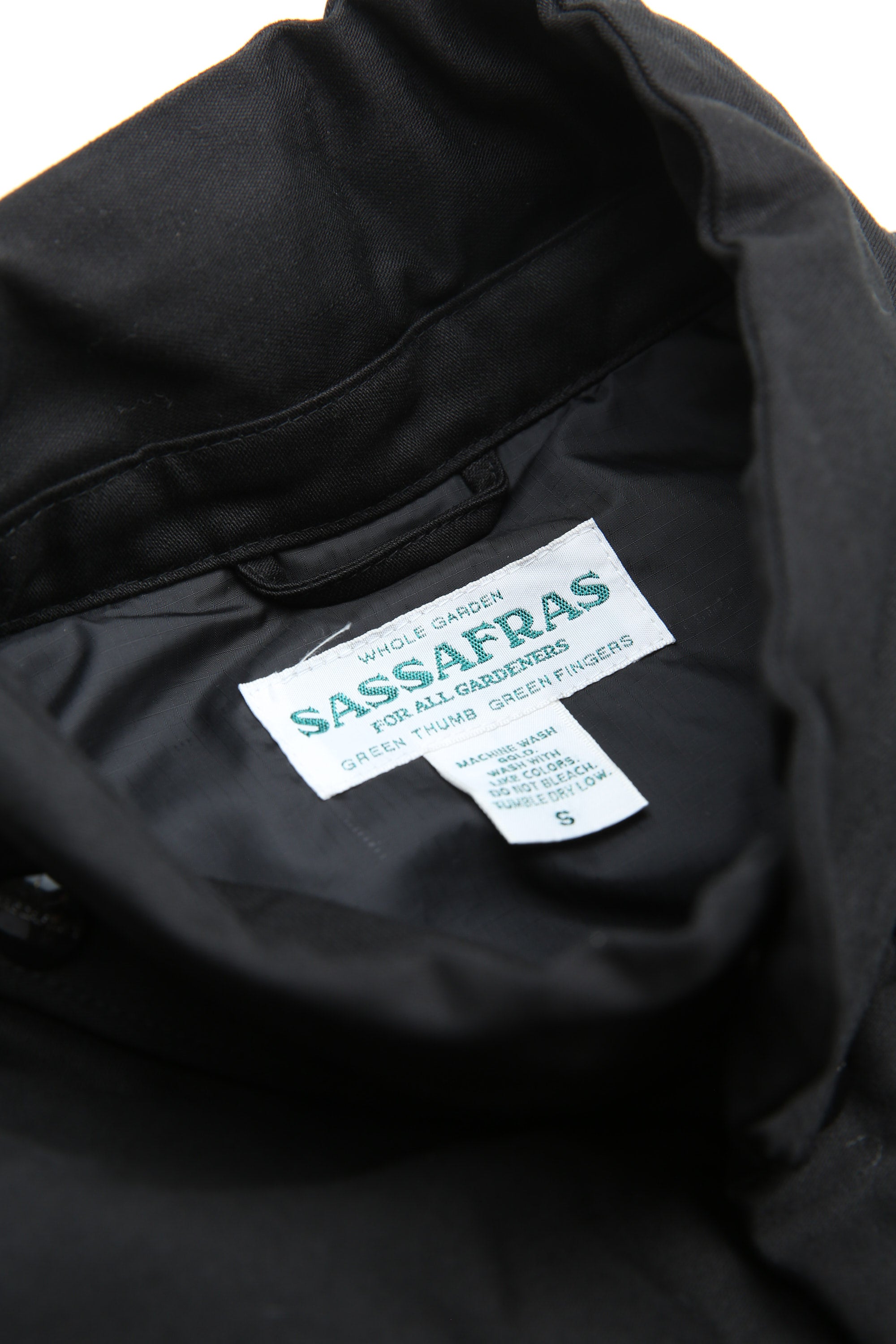 A new insulated jacket made from back satin fabric, it's based on the classic M-65. The collar is a stand-up collar with a hidden hood stow. There are pockets on the left and right front that have two compartments which can be accessed from the top or the side. There is also a large pocket with three compartments on the back. The cuffs are ribbed and filled with padding for warmth. The jacket fits wide to allow for additional layers to be worn underneath.