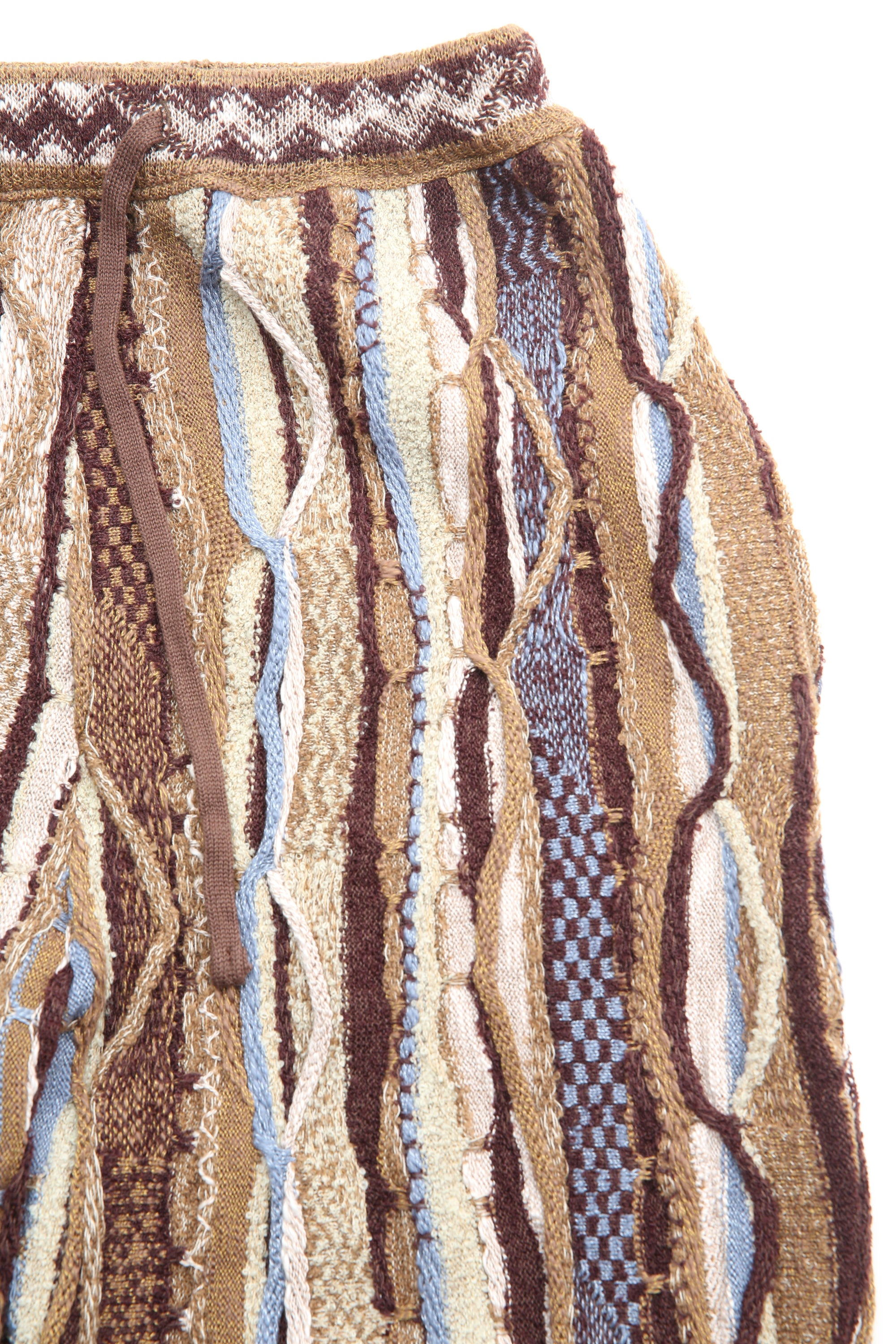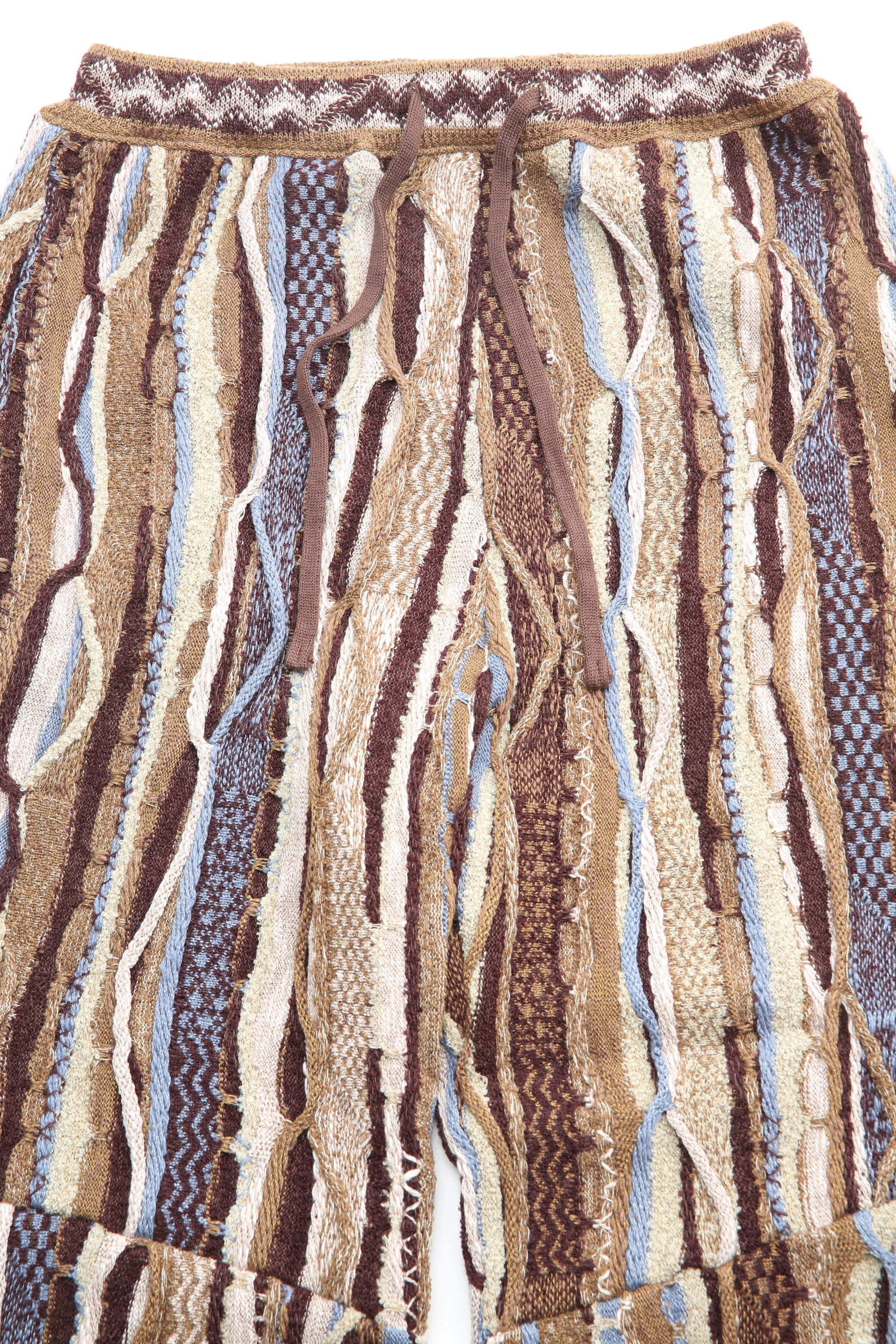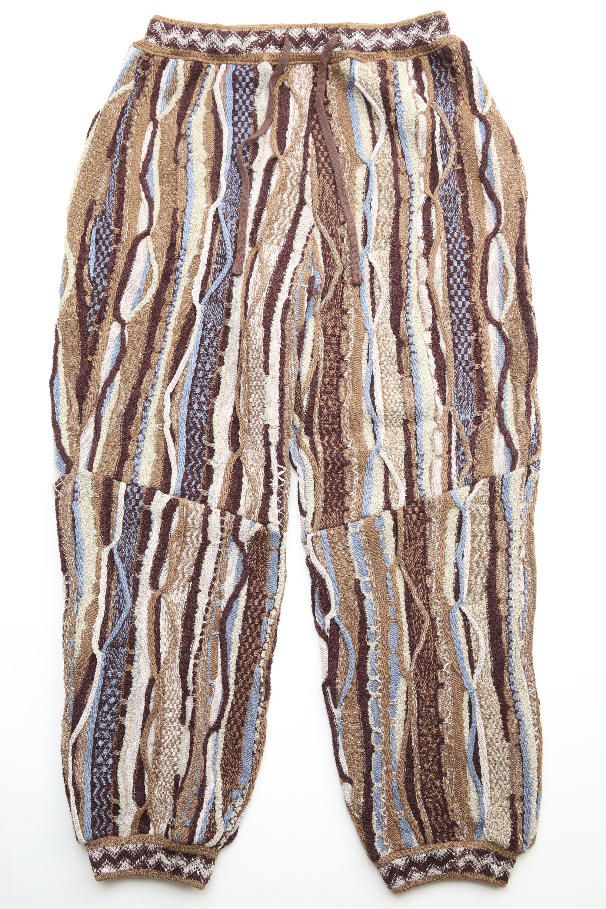 An easy pull-on pant in an all-over technique of 'boro' stitching with a variety of stitch and patterned weaves. Constructed from a soft yarn with a heavy-gauge mid-weight cotton. Style features a relaxed fit through the leg that tapers slightly at the hem. Finished with two side seam pockets and an adjustable drawstring waist.