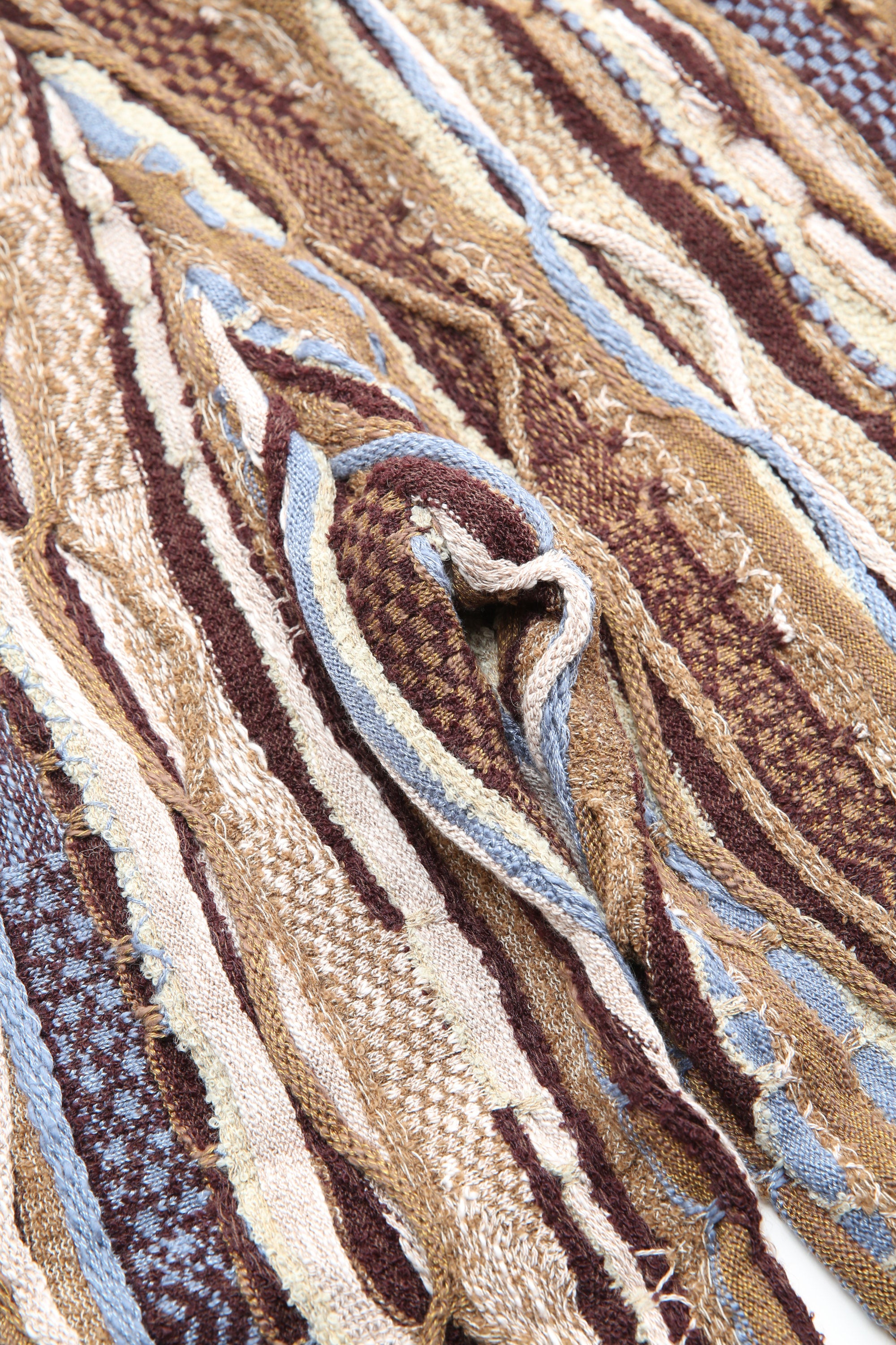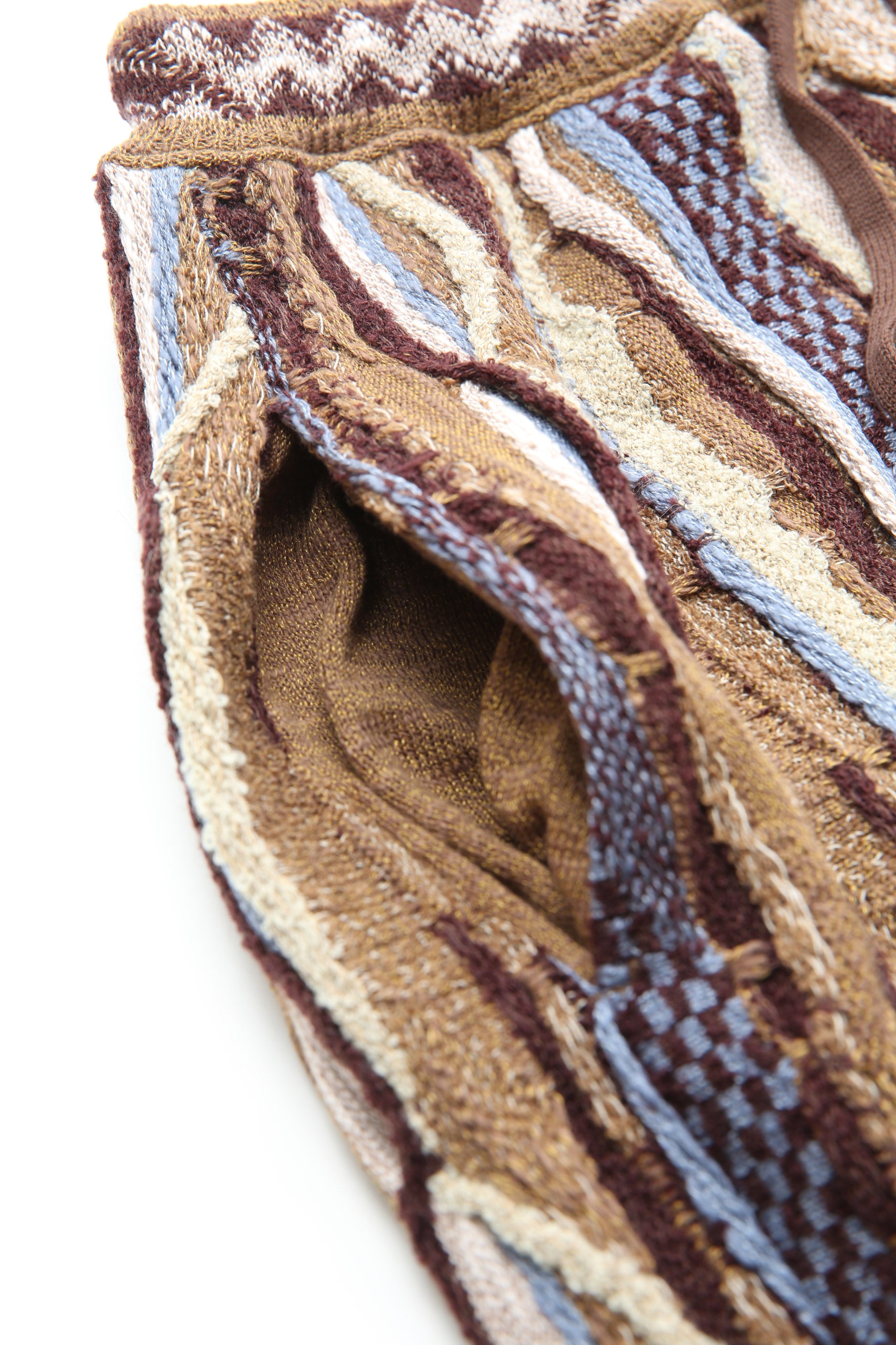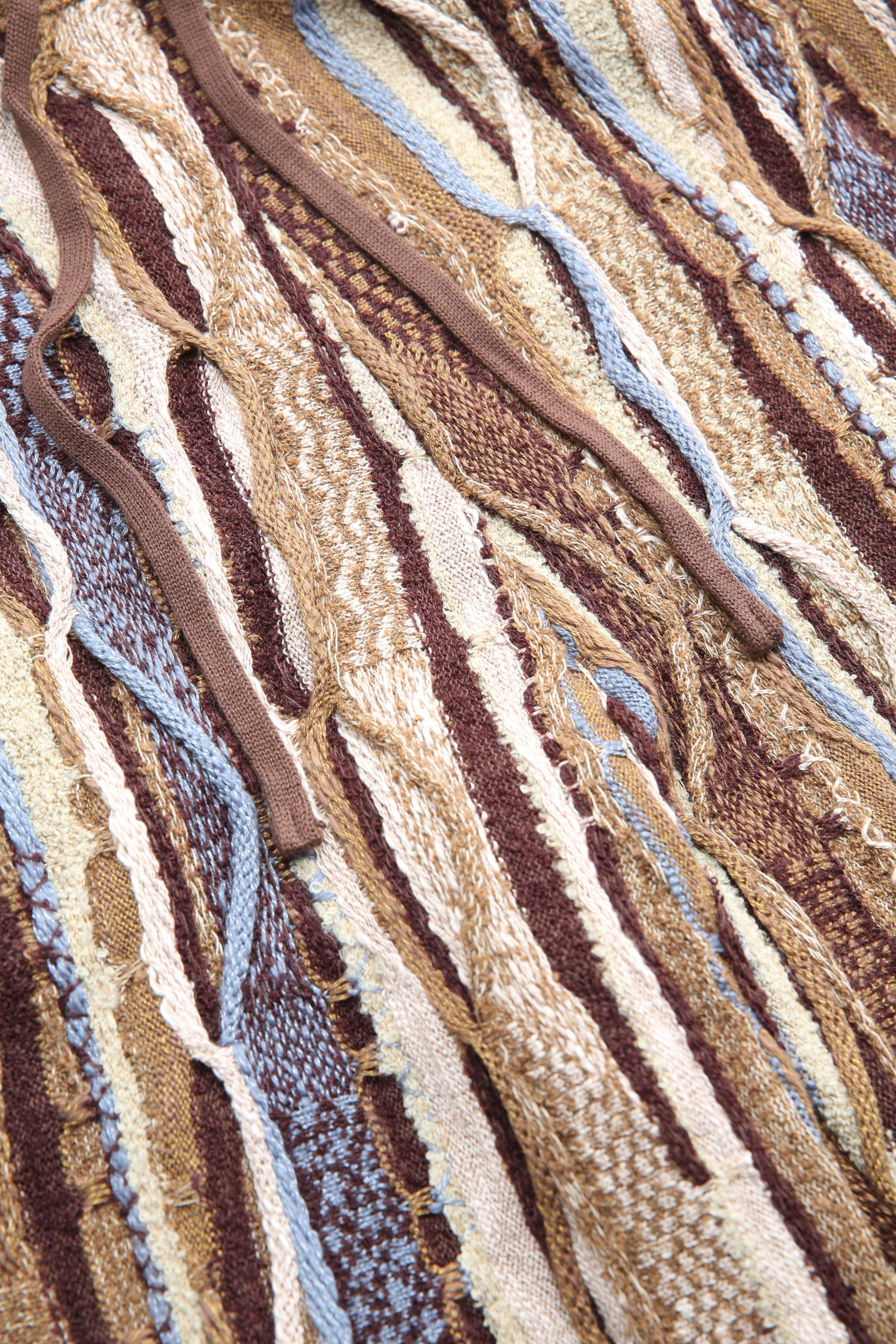 An easy pull-on pant in an all-over technique of 'boro' stitching with a variety of stitch and patterned weaves. Constructed from a soft yarn with a heavy-gauge mid-weight cotton. Style features a relaxed fit through the leg that tapers slightly at the hem. Finished with two side seam pockets and an adjustable drawstring waist.