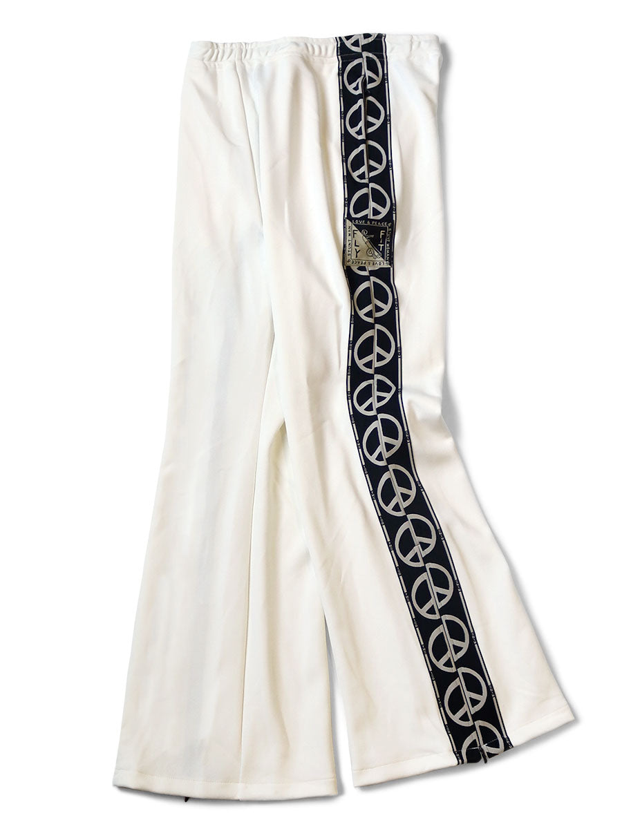 Track pants using piece mark patterned tape designed with the letter "D" in a mirror. We use a jersey material with a smooth and smooth structure. A clean flared silhouette with a zip on the hem. The waist is elastic and draw cord.