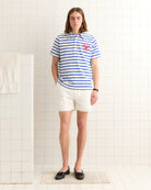 This polo is inspired by a marinière from the French Navy, c.1952. We reproduced the striped fabric for this style, which is embellished with a flocked red crest.