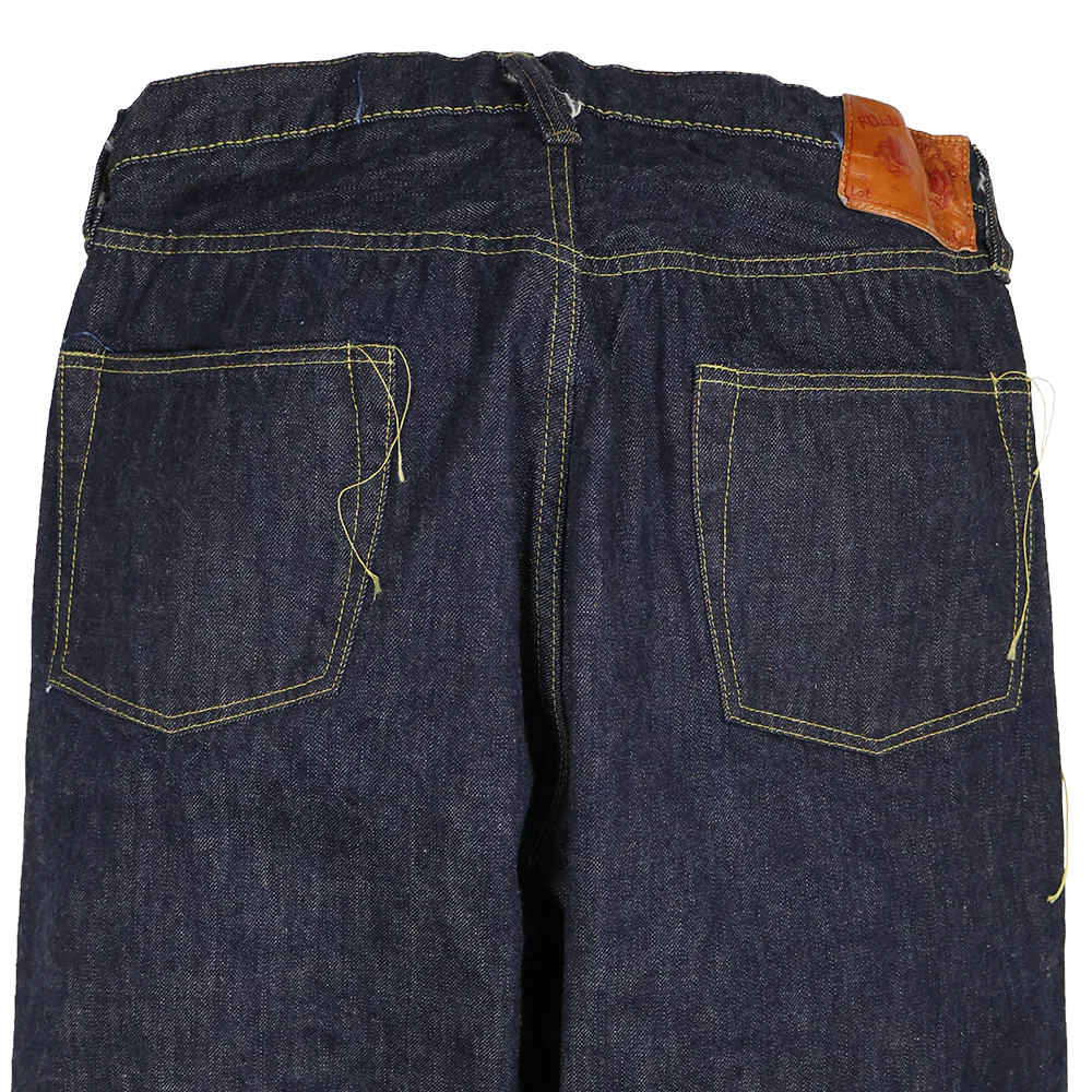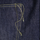 The main appeal of the Great War models is probably the simplified details that were adopted due to restrictions on the use of supplies during the war. But, from another angle, the rough sewing done by inexperienced seamstresses who were sent out from other workplaces due to wartime personnel shortages can also be said to be one of the charms. This time, Fullcount has homed in on this aspect and has come up with a powerful piece by taking it even a step further. The details are based on the 0105, with a slightly deeper rise, large distorted back pockets, heathered yarn flannel for the pocket slacks, one-star arabesque buttons for the fly button, rivets without engraving, and the lower part of the carry-out is not folded in but left cut, and the thread is not pinched, making it look like a partly-unfinished product. There is nothing wrong with wearing it as it is, but you can even try finishing these off yourself.