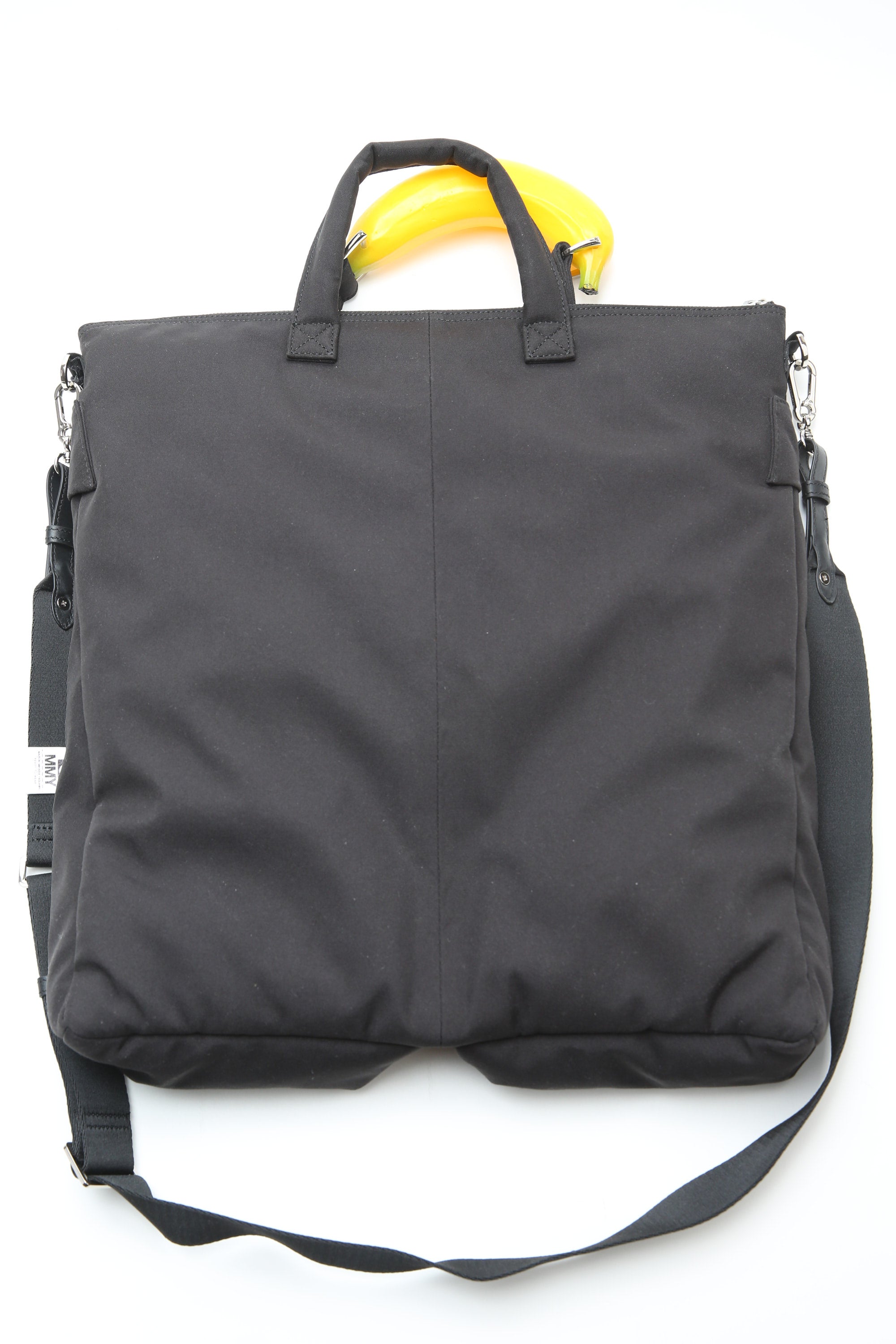 Introducing the Maison Mihara Yasuhiro Banana Handle Bag in sleek black. This helmet bag boasts a unique handle shaped like a banana, adding a touch of artistic flair. Carry your essentials with sophistication and style. A must-have for any fashion-forward individual.