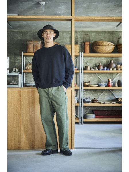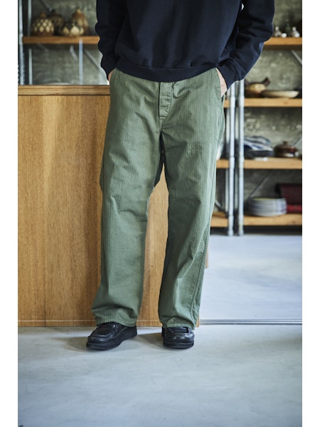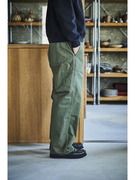 A wide-fit version of our classic FRENCH WORK PANTS. We used a slightly heavier herringbone twill fabric compared to the traditional French work pants.