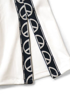 Track pants using piece mark patterned tape designed with the letter "D" in a mirror. We use a jersey material with a smooth and smooth structure. A clean flared silhouette with a zip on the hem. The waist is elastic and draw cord.