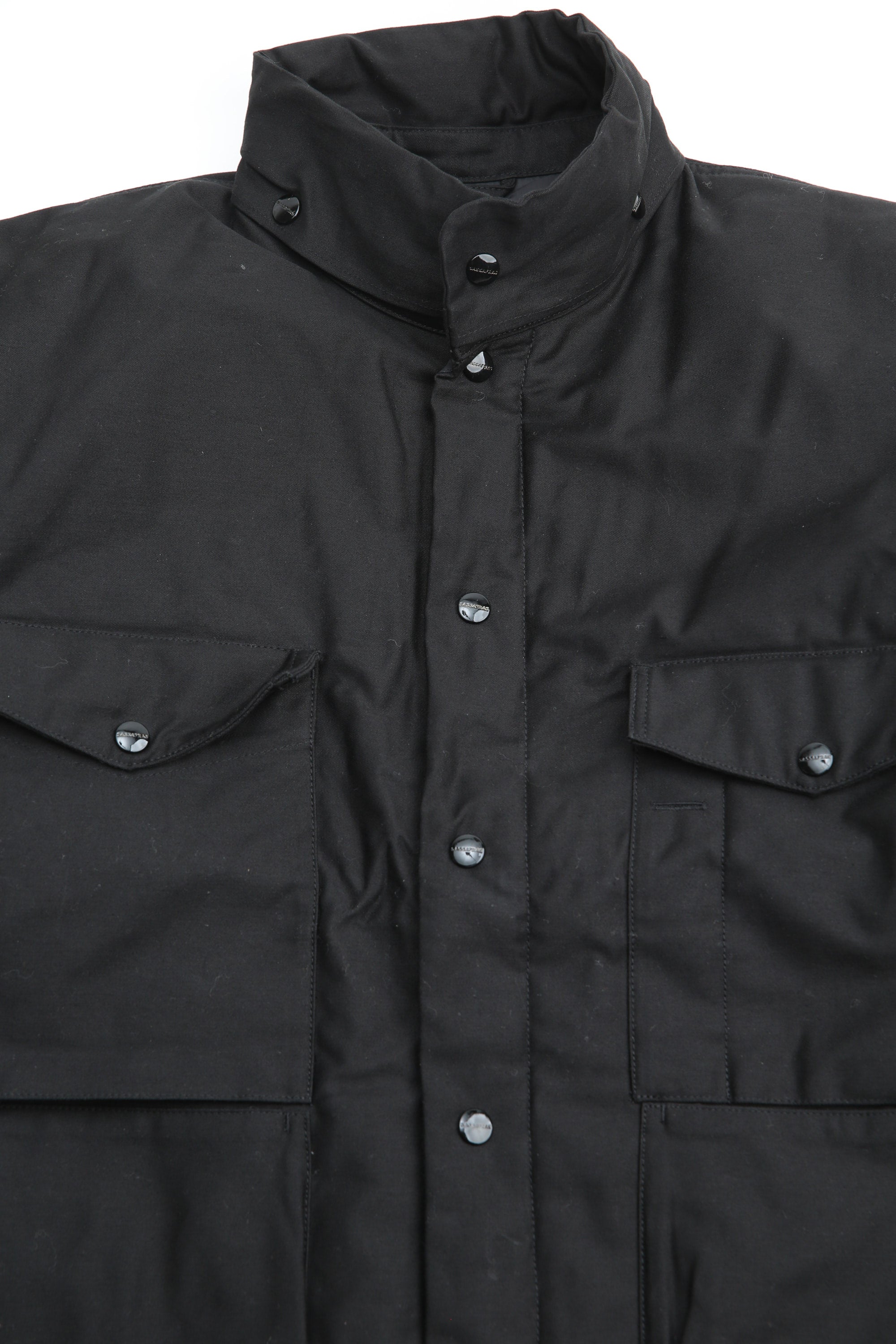 A new insulated jacket made from back satin fabric, it's based on the classic M-65. The collar is a stand-up collar with a hidden hood stow. There are pockets on the left and right front that have two compartments which can be accessed from the top or the side. There is also a large pocket with three compartments on the back. The cuffs are ribbed and filled with padding for warmth. The jacket fits wide to allow for additional layers to be worn underneath.