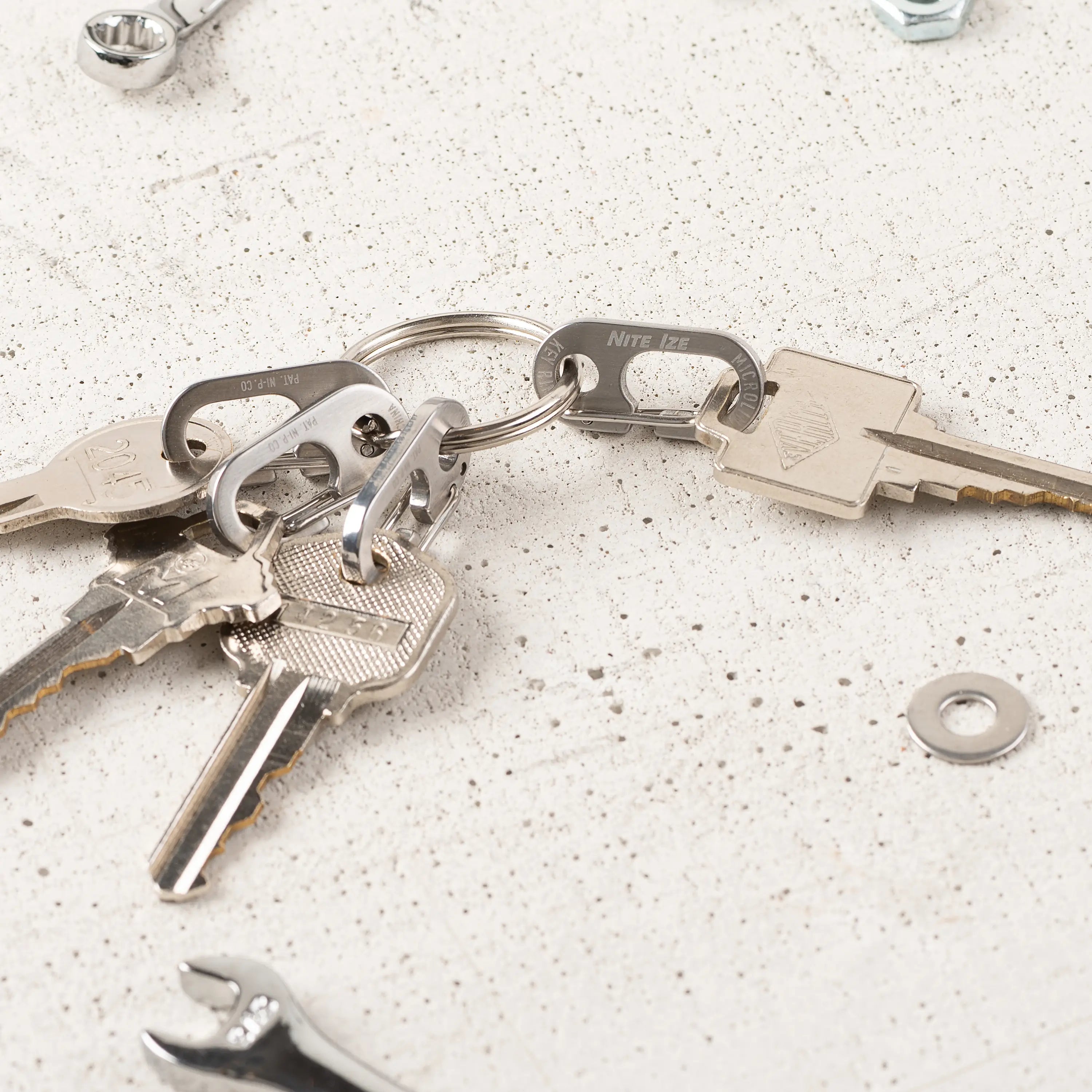 Prying open split rings to access keys is a pain of the past with this streamlined design, featuring a split ring with four Eyelet MicroLink Carabiners for easy key attachment, security, and removal.