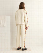 This jacket is inspired by an organza collar from the 1960s, which featured colorful yarn embroidery. We reproduced the embroidered floral trim for this style, appliquéd around the collar, sleeves, and pockets.