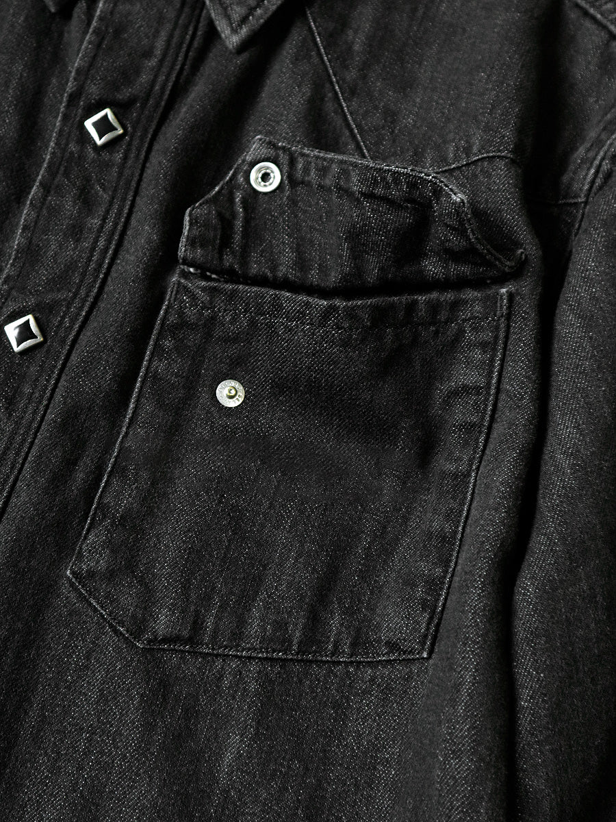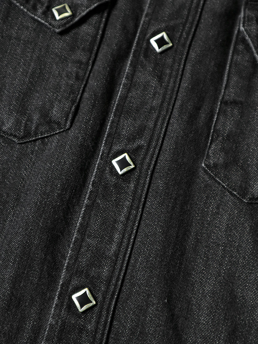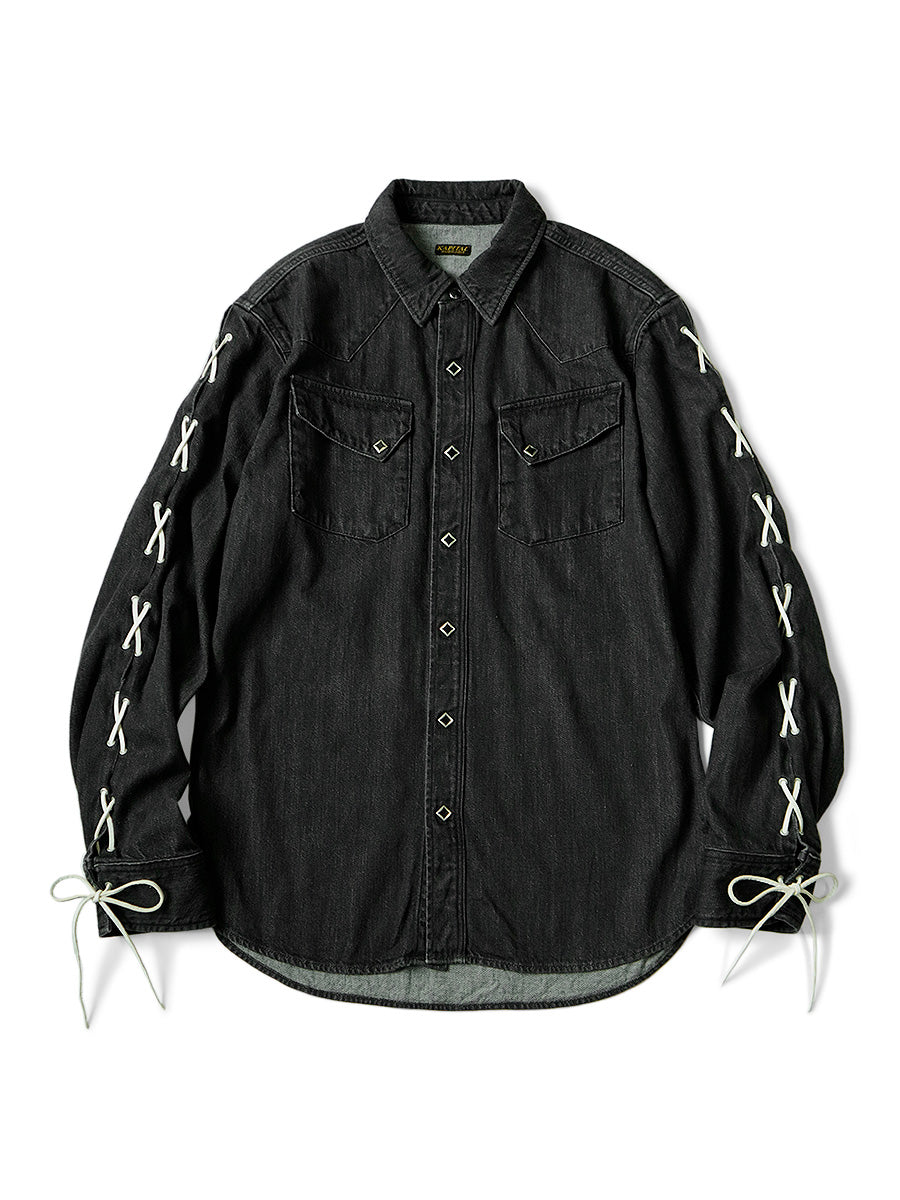A western shirt made from light-ounce black denim that has undergone second-hand processing. It has a simple straight silhouette accented with lace-up sleeves and diamond-shaped dot buttons.