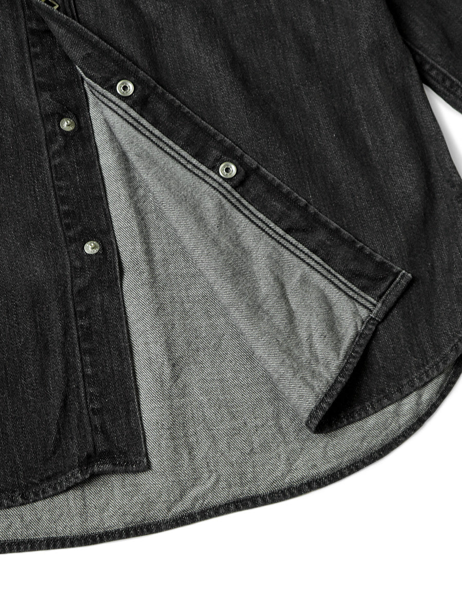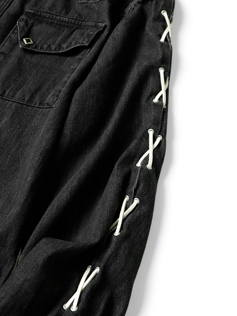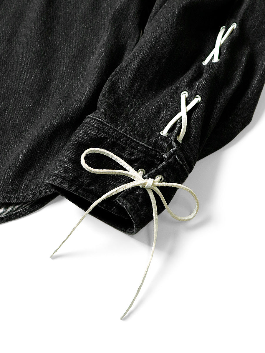 A western shirt made from light-ounce black denim that has undergone second-hand processing. It has a simple straight silhouette accented with lace-up sleeves and diamond-shaped dot buttons.