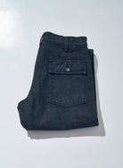 A new color of baker pants made of our original heavy back satin fabric, available only at Samurai Jeans directly-managed stores and overseas dealers. Instead of the usual shiny back satin normally woven with fine yarns, we've created a selvedge back satin made of thick, uneven yarns dyed black and woven with a high-density. Like the Samurai SJ52BP olive baker pants, the fabric is stiff and sturdy at first, but softens and drapes well as the pants are worn in. The sides feature selvedge, just like jeans, and the buttons are tuck buttons to match the heavy fabric.