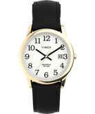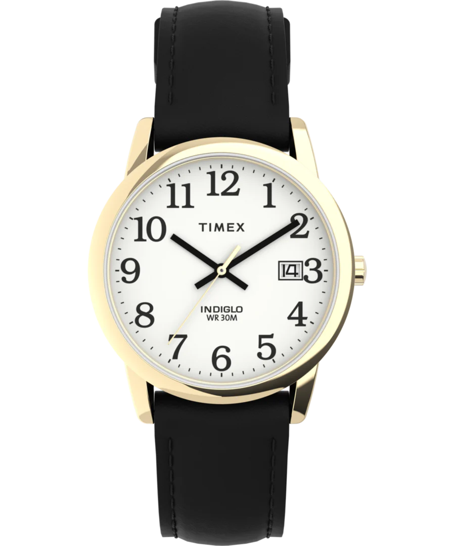 This Timex® Easy Reader watch features a crisp, easy-to-see dial that makes checking the time a breeze. Its genuine leather strap is treated to resist water and gets comfier with every wear. Keep track of the day with the handy date window, and don’t worry about little splashes—it's water resistant up to 30 meters (just no swimming, please!). When night falls, a quick press lights up the dial with Timex’s classic INDIGLO® glow, so you’re never left guessing the hour.