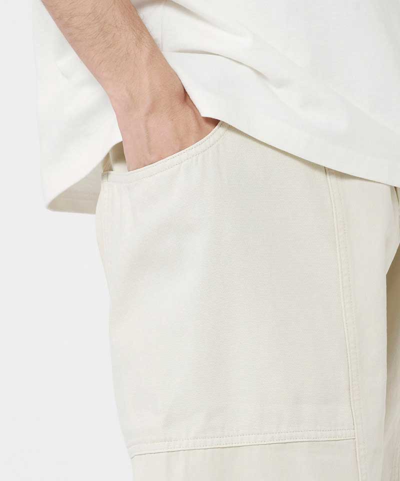 These pants are able to hold gadgets to suit modern lifestyles, while maintaining the functionality during climbing that serves as the brand's roots. Highlighted by large pockets extending from the front to the back, the silhouette has a comfortable looseness. Tough canvas is used for these pockets, while the contrast between the two types of materials through garment dyeing is another notable feature. Also, the D-ring with the brand logo on the right side is useful outdoors and in the city, as it can hold keys and bottles. They are made of 100% organic cotton twill with high durability, tension, and stiffness that can even withstand strenuous movement and dyed to give character to their appearance.