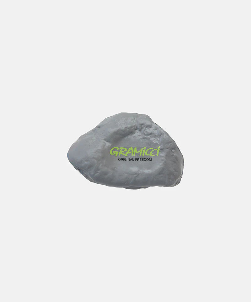A foam stress ball shaped like a rock with Gramicci branding, because climbers needed a way to hold rocks even when they are not climbing. It is either peak brand awareness or just a really committed joke. Either way, it's a squeezable rock that helps with stress, which is honestly perfect for people whose hobbies involve hanging off actual rocks by their fingertips.